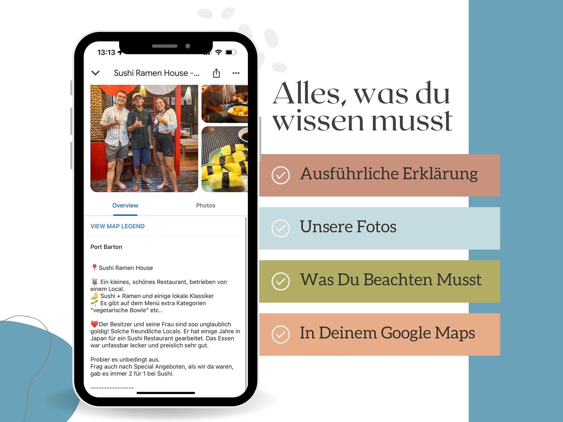 Kurz gesagt: Du musst nichts mehr aus YouTube/Blogs/PDFs aufwändig in Dein Google Maps übertragen, sondern hast alles direkt auf deinem Handy oder Laptop. (Und Du kannst ab jetzt alle YouTube Videos zum Reiseziel ganz ohne Handy in der Hand genießen)