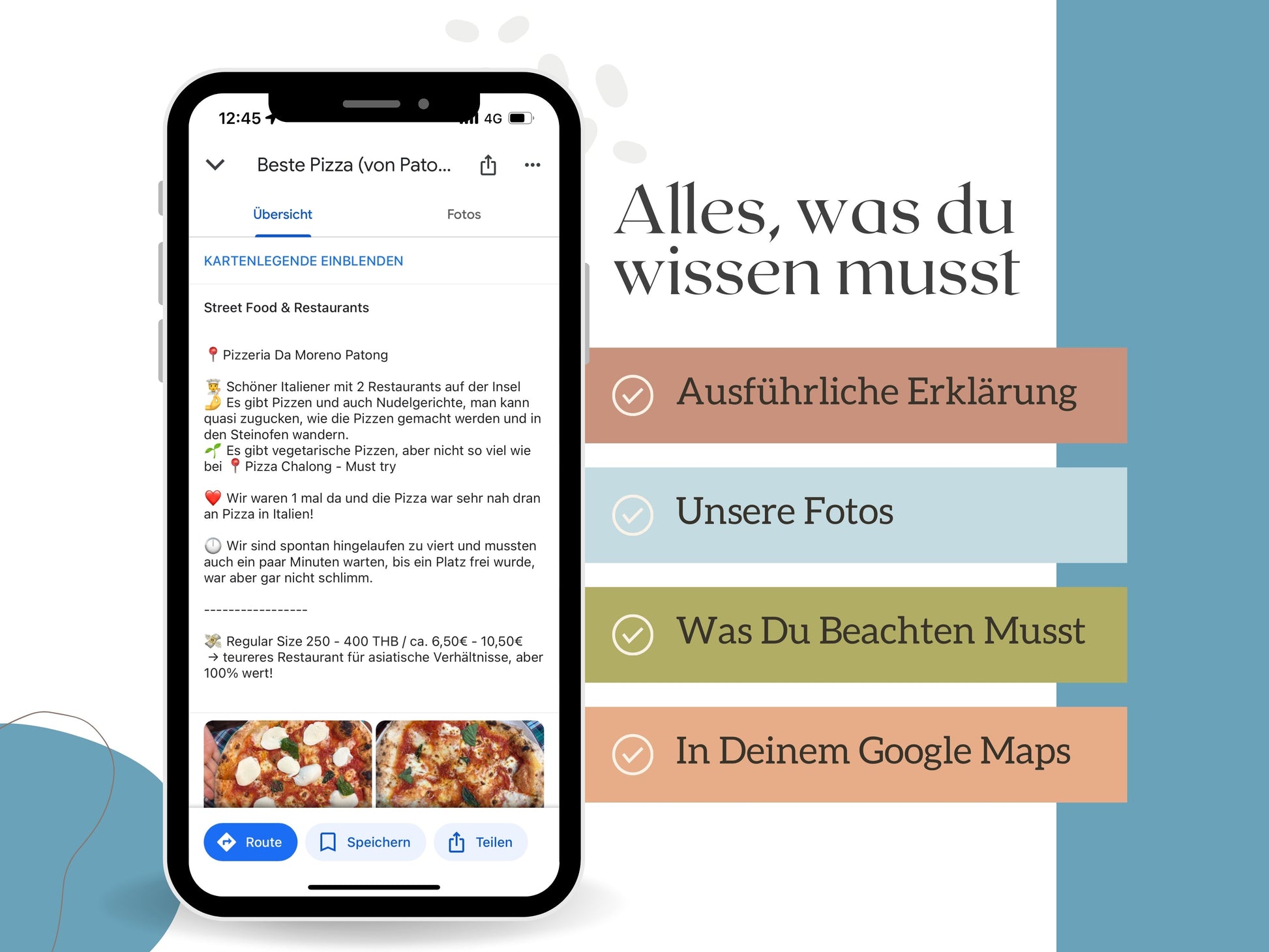 Kurz gesagt: Du musst nichts mehr aus YouTube/Blogs/PDFs aufwändig in Dein Google Maps übertragen, sondern hast alles direkt auf deinem Handy oder Laptop. (Und Du kannst ab jetzt alle YouTube Videos zum Reiseziel ganz ohne Handy in der Hand genießen)